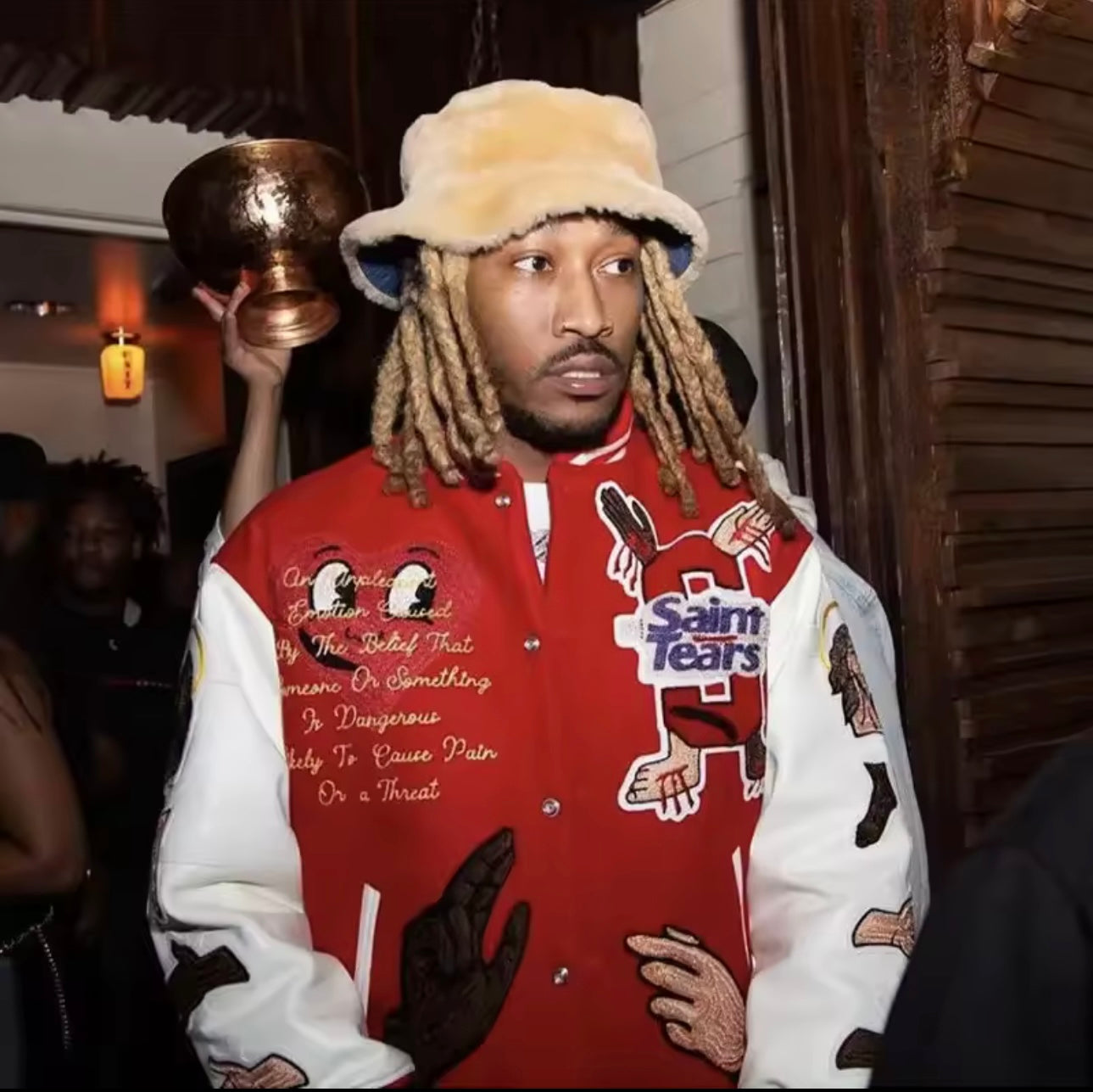 Bold and dramatic. The Saint Tears varsity mixes religious artwork, full chenille patches, and clean embroidery for a jacket that looks designer without the designer price. Warm, heavy, and instantly noticeable.